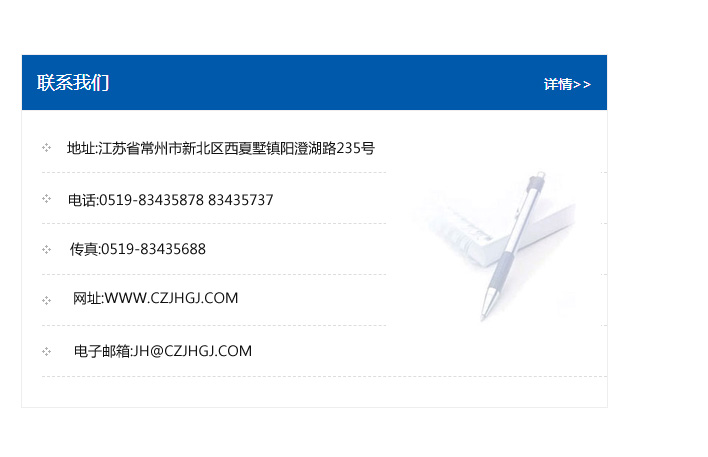 地址:常州市新北區(qū)友邦商務(wù)大廈1幢16、17層  電話:0519-85101652  傳真:0519-85112595  郵編:213022  網(wǎng)址:www.cz-jiayue_cn.wj-jiacheng.com  郵箱:xiajifengaa@163.com